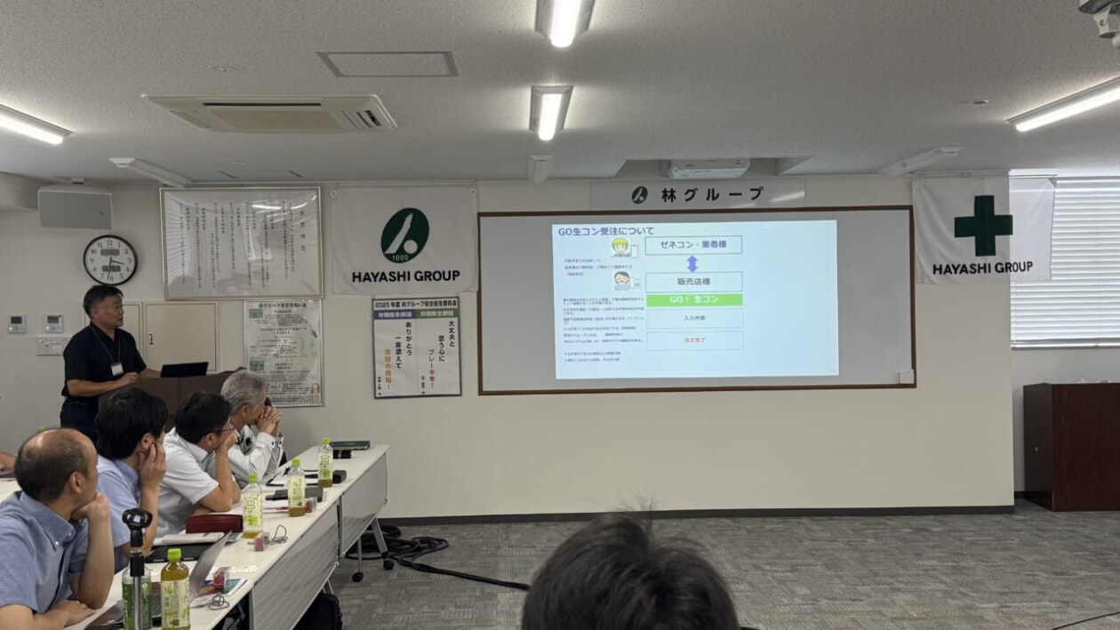 情報交換会では、林グループが導入した「GO生コン」システムも紹介されました。GO生コンは、スマートフォンやパソコンから24時間い